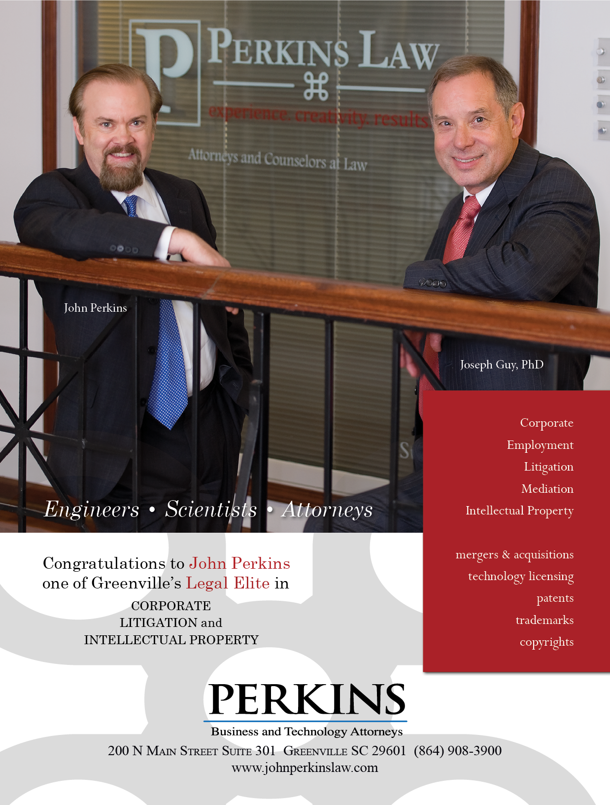 GREENVILLE, S.C. – Greenville Business Magazine has recognized John Perkins as Legal Elite in three different practice areas. Perkins is founder of Emergent Law Firm.